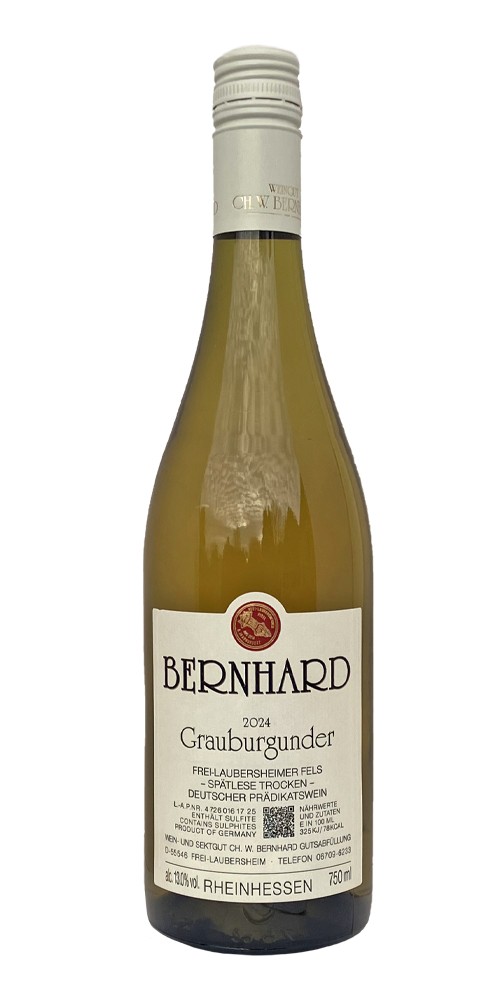 Weingut Ch.W. Bernhard råder over vinmarker, der hører til de bedste i Rheinhessen. Her nyder man godt af et mildt, solrigt klima, og med marken Frei-Laubersheimer Fels, der ligger på en østvendt klippeskråning har Weingut Bernhard en veritabel trumf på hånden. Markens jordbund består af en blanding af mergel, feldspat, kvarts og den vulkanske bjergart ryolit, og vinstokken har, takket være sine stærke rødder, en formidabel evne til at trænge adskillige meter ned i denne undergrund af forvitret klippe. Hartmut og Petra Bernhard har i en årrække produceret en serie velestimerede hvide og røde vine. Her drejer det sig om Grauburgunder. På fransk hedder druen Pinot Gris, den grå Pinot. Pinot Noir har været dyrket i århundreder, og i dette tidsrum er der opstået en del spontane mutationer─ ændringer i druens arvemasse. For den grå Pinots vedkommende drejer det sig om mutationer i de gener (arveanlæg), der styrer dannelsen af farvestoffer i drueskallen. Så den grå Pinot er en klon, en genetisk kopi, af den sorte Pinot bortset fra de arveanlæg der giver drueskallen en blårød farve.