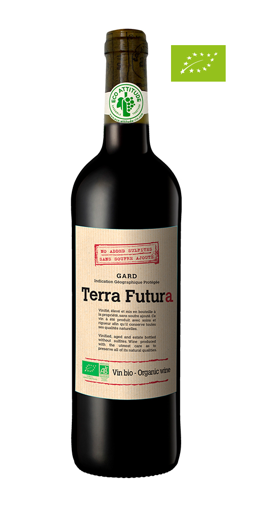 Der er ikke noget malerisk over Terra Futuras etiket, men teksten er til gengæld meget oplysende. GARD IGP er en appellation for vine, der dækker hele Gard distriktet. Vin Bio bladet attesterer domænets økologiske certifikat; Domaine de Tavernel er øko-pioner med økologisk drift siden 1987. ”Eco Packaging” vil sige at alle materialer fra glasflaske til papkasse er genbrug. Det røde stempel øverst på etiketten, ”Sans soufre ajouté” fortæller, at vinen er lavet uden tilsætning af svovl. Det betyder at domænet er parat til at gå hele vejen i bestræbelserne på at gøre sig fri af kemi. Vinifikation uden svovl har vist sig at være mulig med rødvin ved dels at beskytte mosten mod luftens ilt under hele vinifikationen, dels fordi den røde vins farve- og garvestoffer beskytter vinen i flasken mod iltning og angreb fra bakterier. Til gengæld skal man ikke satse på at vinen kan holde sig frisk i lang tid efter at flasken er åbnet. Vinen er lavet på en blanding af Merlot (60%) og Marselan (40%). Begge druesorter har ret tykke drueskaller, som har givet vinen i glasset en tæt, rubinrød farve. Duften har toner af rød bærfrugt, solbær og brombær, og de røde bær går igen i smagen sammen med et strejf af chokolade. Det lave svovlindhold har givet liv og aromatisk kompleksitet i eftersmagen, der slutter med en rank tanninstruktur.